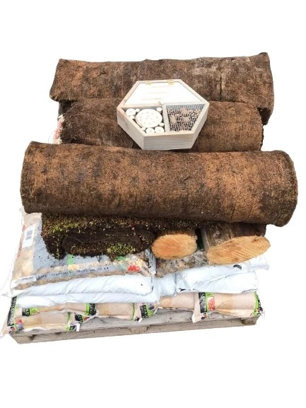 Dit pakket bestaat uit producten die allemaal 1 ding gemeen hebben: ze hebben een positieve invloed op de biodiversiteit. Met dit pakket geef je insecten een nieuw leefgebied, waardoor ook andere dieren zich komen vestigen. Het pakket is geschikt voor alle platte daken en daken tot 10 graden. Bij het pakket horen 4 sedummixmatten, 13 zakken daktuinsubstraat van 20 liter, 5 zakken zand, 5 zakken grind, 2 zakken pebblestones, 2 eiken boomstammen, 6 m² beschermdoek en