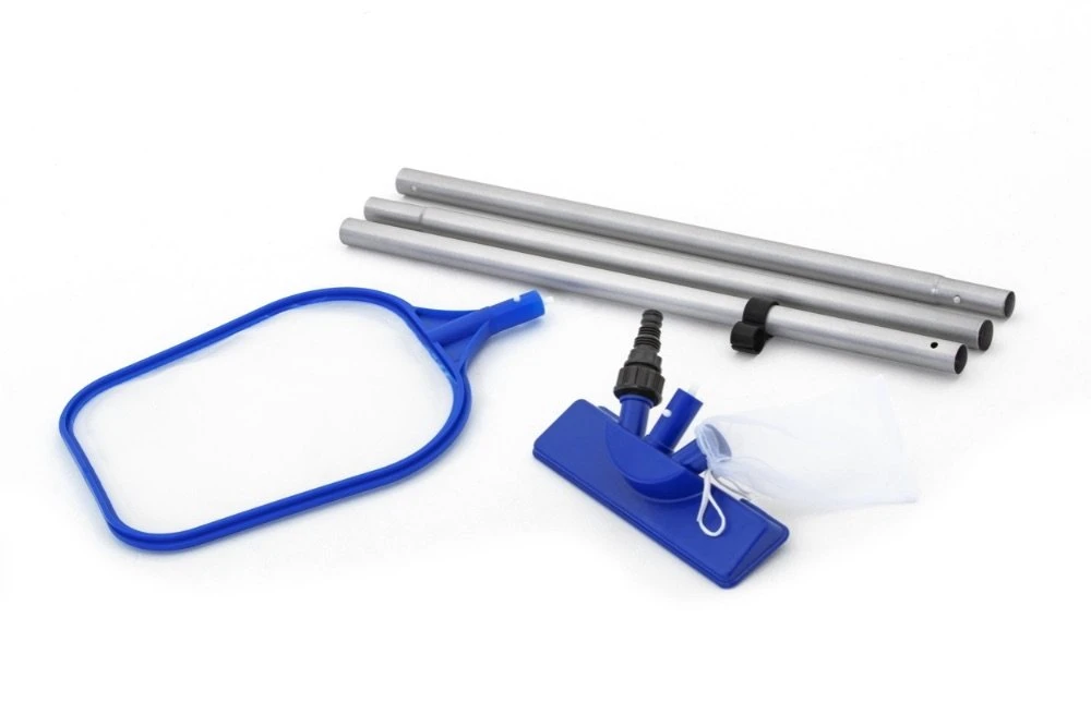 Schoonmaakset voor de reiniging van zwembaden met een max. diameter 366 cm. Werkt via een tuinslang (venturi-effect). Ook geschikt voor zwembaden zonder pomp. Set bevat borstel met herbruikbaar vuilopvang zakje, lichtgewicht steel en oppervlaktenet. Lengte steel: 167 cm.