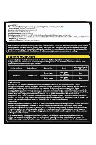 KB Muizen Lokdoos Pasta ‘Magik Paste’ is een zeer aantrekkelijk lokaas voor het bestrijden van huismuizen in zowel droge ruimtes (zolder, vloeren, plafonds, garages, etc.) als in vochtige ruimtes (kelders, magazijnen, etc.). De kant-en-klare lokaasdoos bevat 10 gram pasta. Het zakje niet openen, de muizen eten hier doorheen.