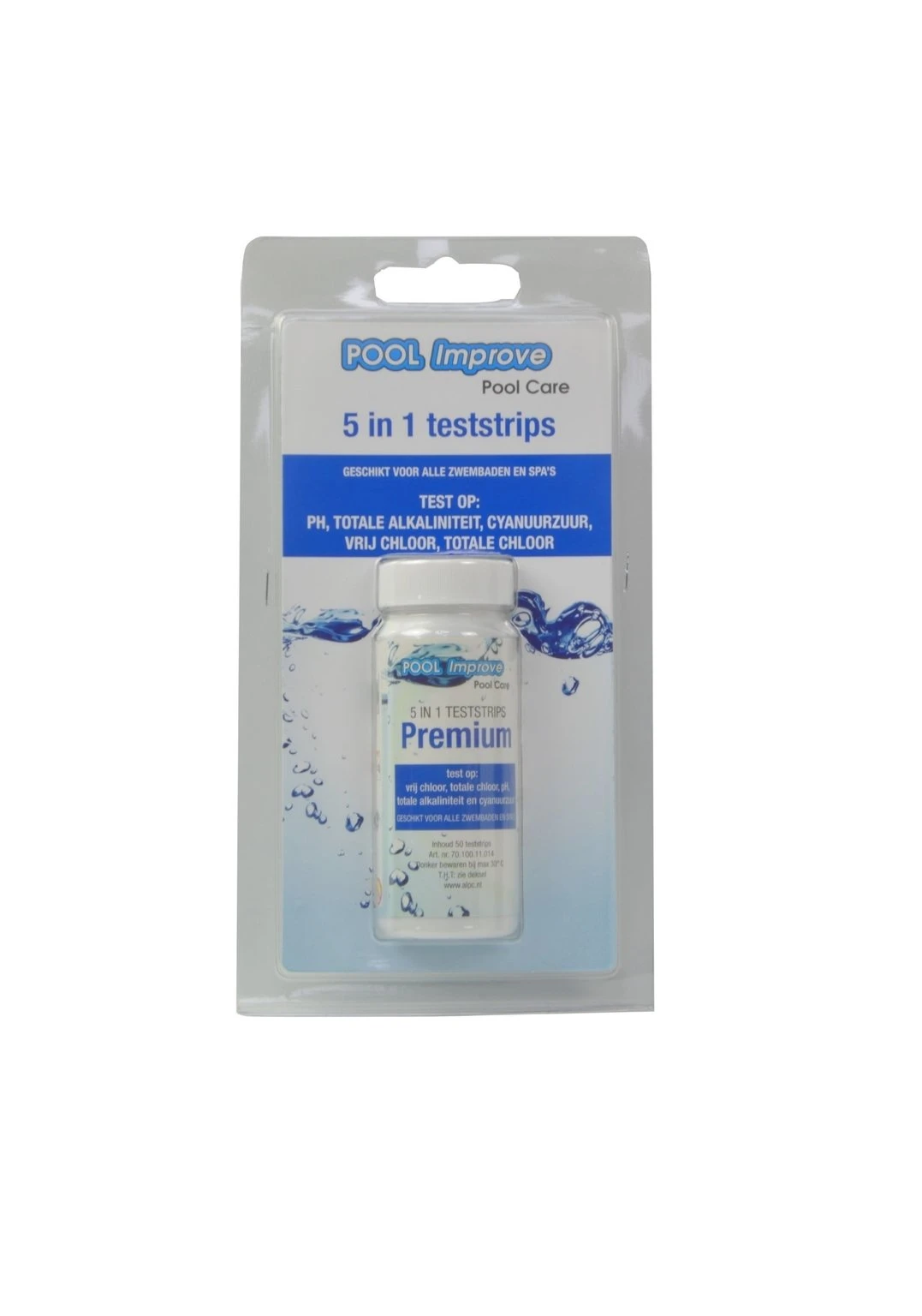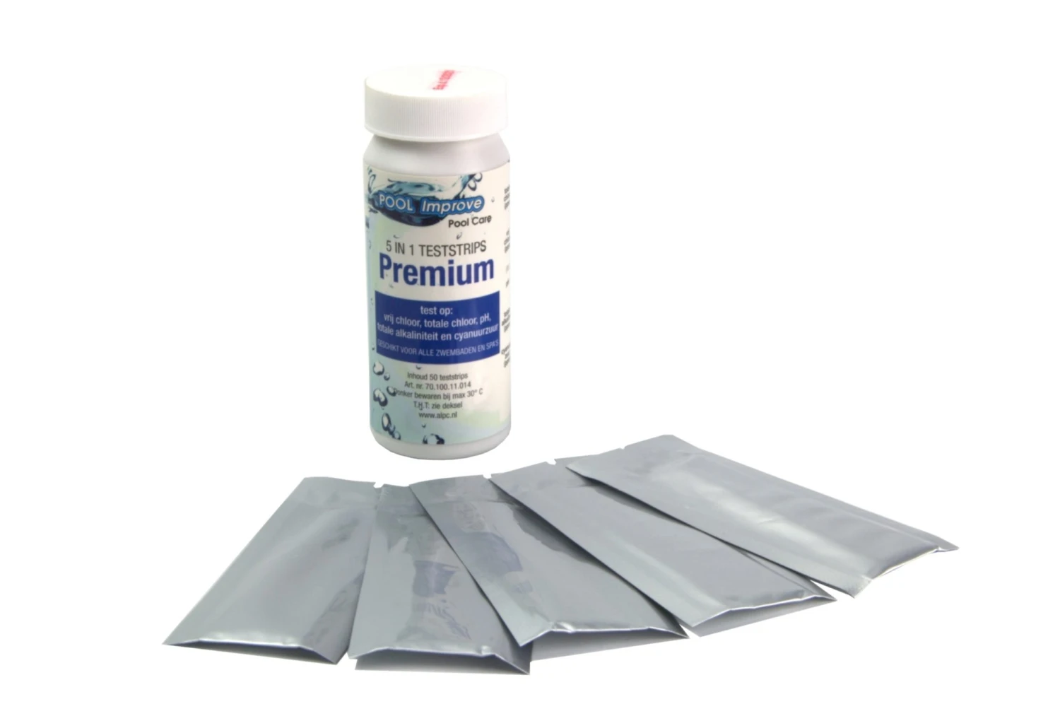 De strips kunnen gebruikt worden voor het testen van zwembadwater. Deze strips worden onder water gedompeld waarna de kleuren kunnen worden vergeleken. Deze 5 in 1 strips meten het vrije chloor, totale chloor, pH-waarde, cyanuurzuur en alkaliteit. De strips zijn per 10 verpakt in aluminiumfolie voor betere testresultaten. Per verpakking zitten er 50 teststrips in. Voor gebruik de gebruiksaanwijzing aandachtig doorlezen.